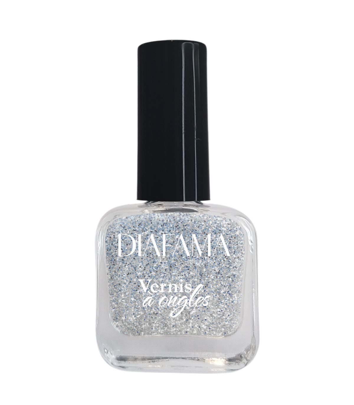Couleur Argent pailleté, vernis transparent avec des paillettes irisées et argentées.